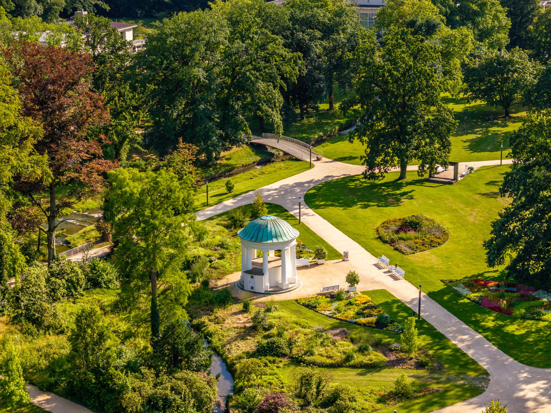 Mit über 100 Hektar Fläche lädt der Kurpark zum Flanieren ein. Wandelhalle, Konzerthalle und der historische Leopoldsprudel bilden den kulturellen Rahmen. Geführte Rundgänge zeigen die schönsten Ecken – von der Blumenpracht bis zur Solequelle.