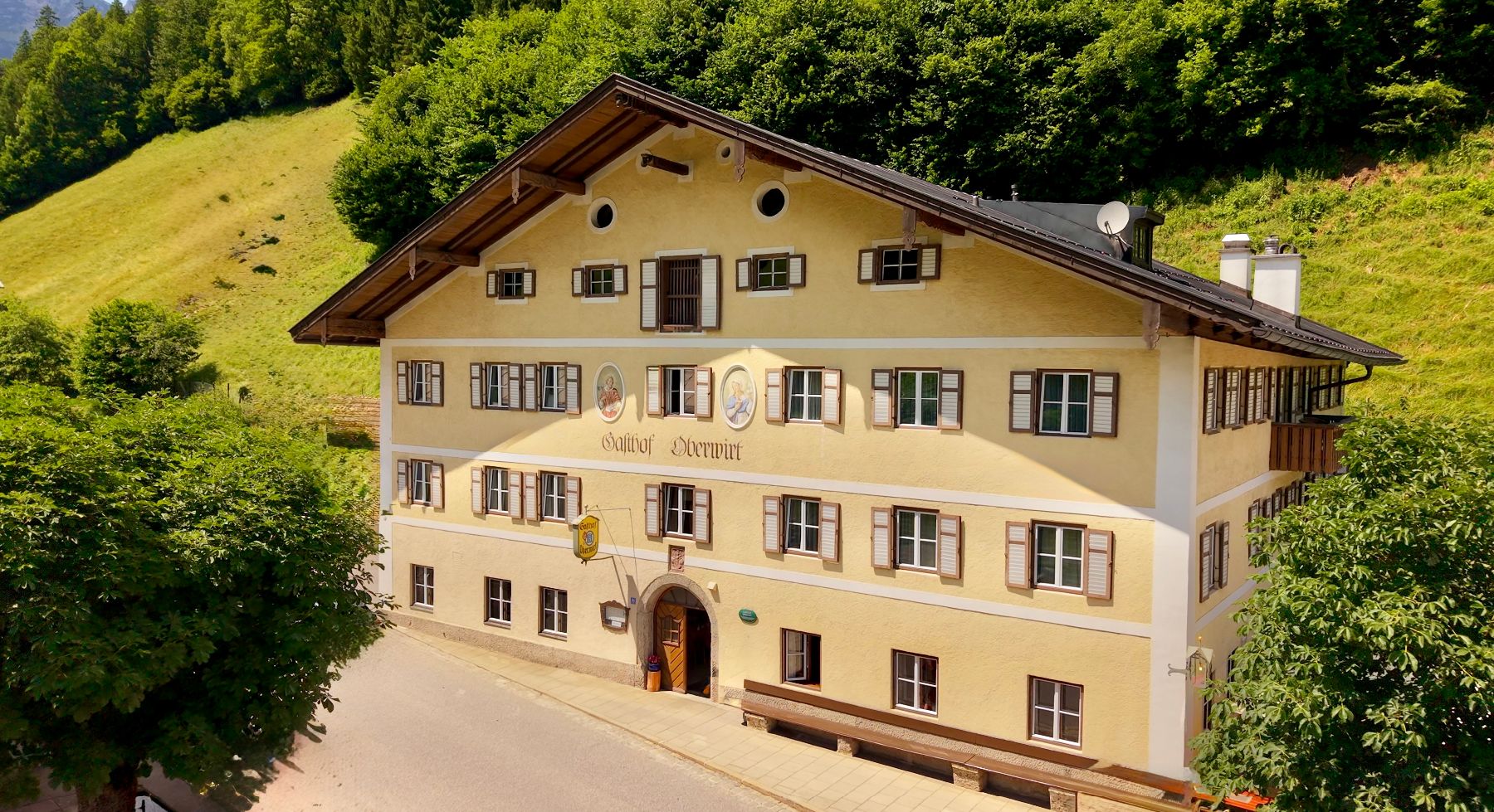 Neben berühmter Pfarrkirche in Ramsau. 3.5km vom Hintersee entfernt. Eigener Parkplatz für Bus